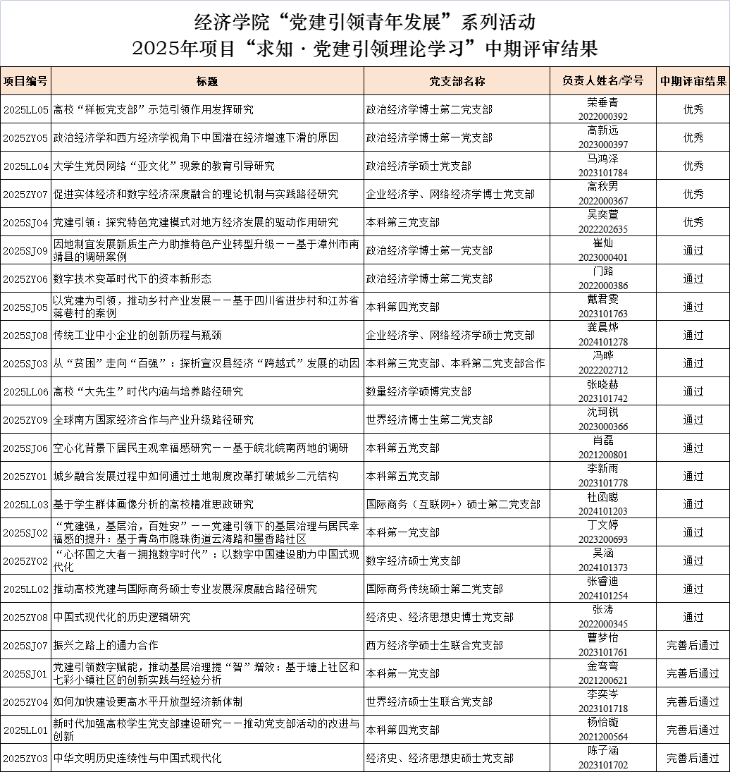 本次“党建引领青年发展”系列活动中期评审的顺利召开,有力彰显了经济学院师生投身党建工作的高度热情,生动展现了新时代学生党员理想信念坚定、能力本领过硬的精神风貌,积极发挥了学生党员先锋模范作用和基层党组织战斗堡垒作用,为活动的后续开展奠定了扎实基础。