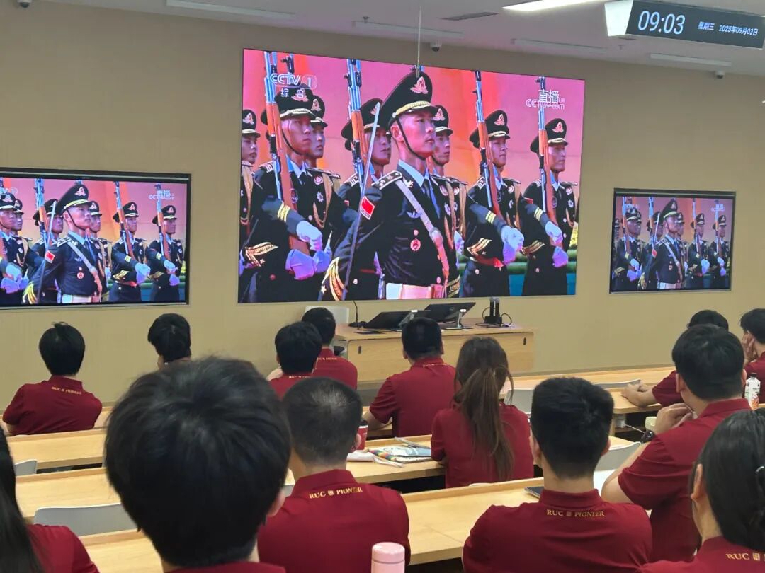 中国人民大学经济学院党委组织全院师生在中关村校区明德主楼728、立德楼701,通州校区经济学部楼117、118,及2025级本科新生在世纪馆集中收看大会直播,共同见证这一庄严时刻。观看直播后,经济学院全体师生第一时间开展各种形式的专题研讨,深入学习领悟总书记重要讲话精神。