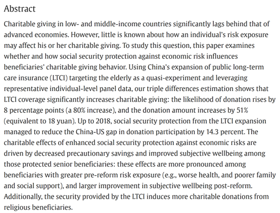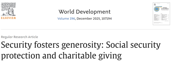 近日,中国人民大学经济学院孙文凯教授(通讯作者)、华东师范大学公共管理学院林琳助理教授和中国人口与发展研究中心何敏助理研究员的合作论文《security fosters generosity: social security protection and charitable giving》在《world development》正式在线发表。